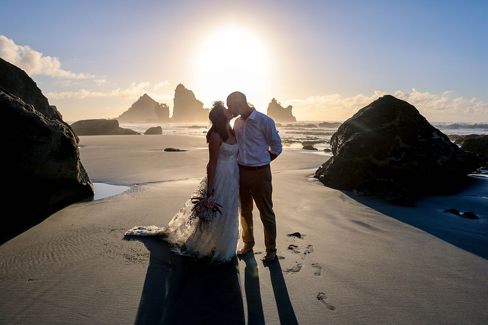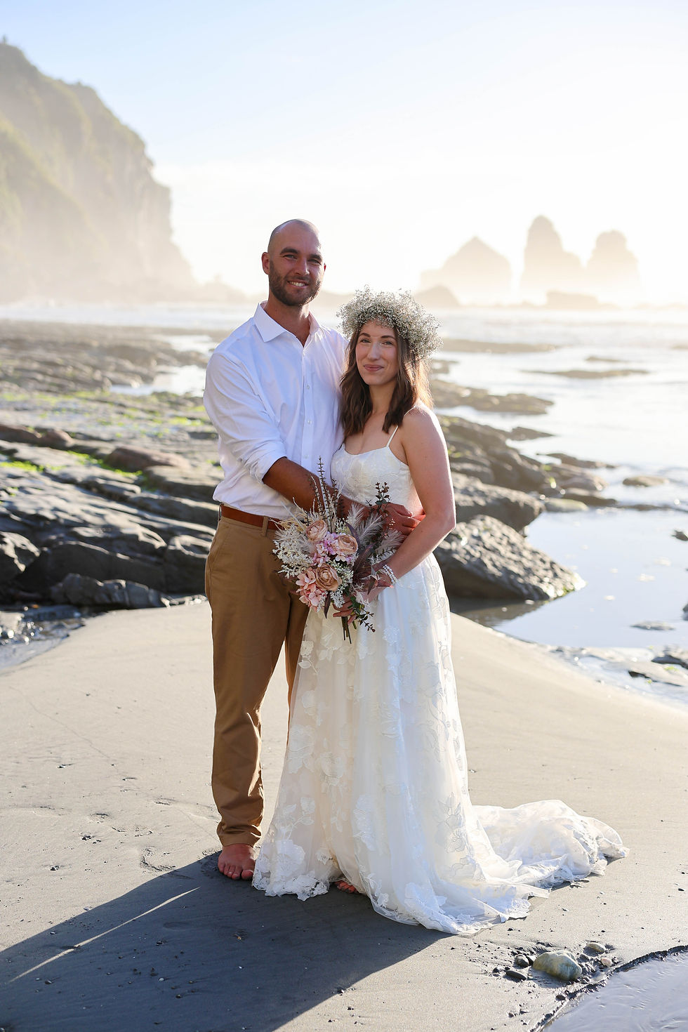 Ayla and Nick celebrated their elopement with their parents and two small daughters. They chose the Pītau experience, deciding to say 'I Do' in the early evening. We took a walk to the sea stacks afterwards to catch the low tide for photos, and wow! What a beautiful couple - we were so glad their gorgeous ceremony and dramatic landscape could bring that out even more.